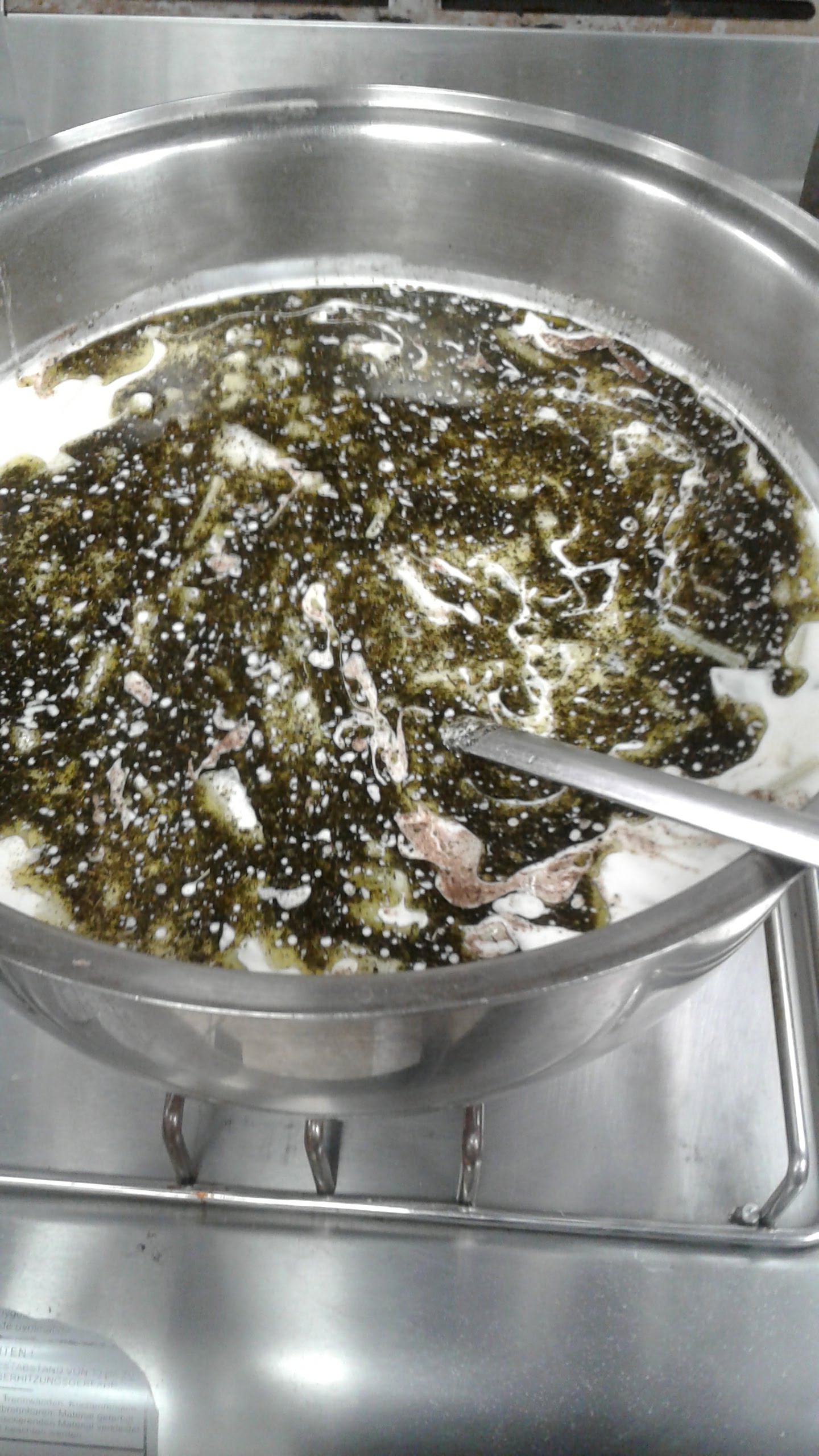 In a small frying pan, melt the butter and olive oil. Once it is melted together, add the mint. Then pour it into the soup. NOTE: IT will simmer, but wait to stir. Ladle a spoon of soup back into the frying pan to get an excess mint, and pour back into the soup. Stir once or twice and serve immediately. The mint mixture will make a beautiful green design.