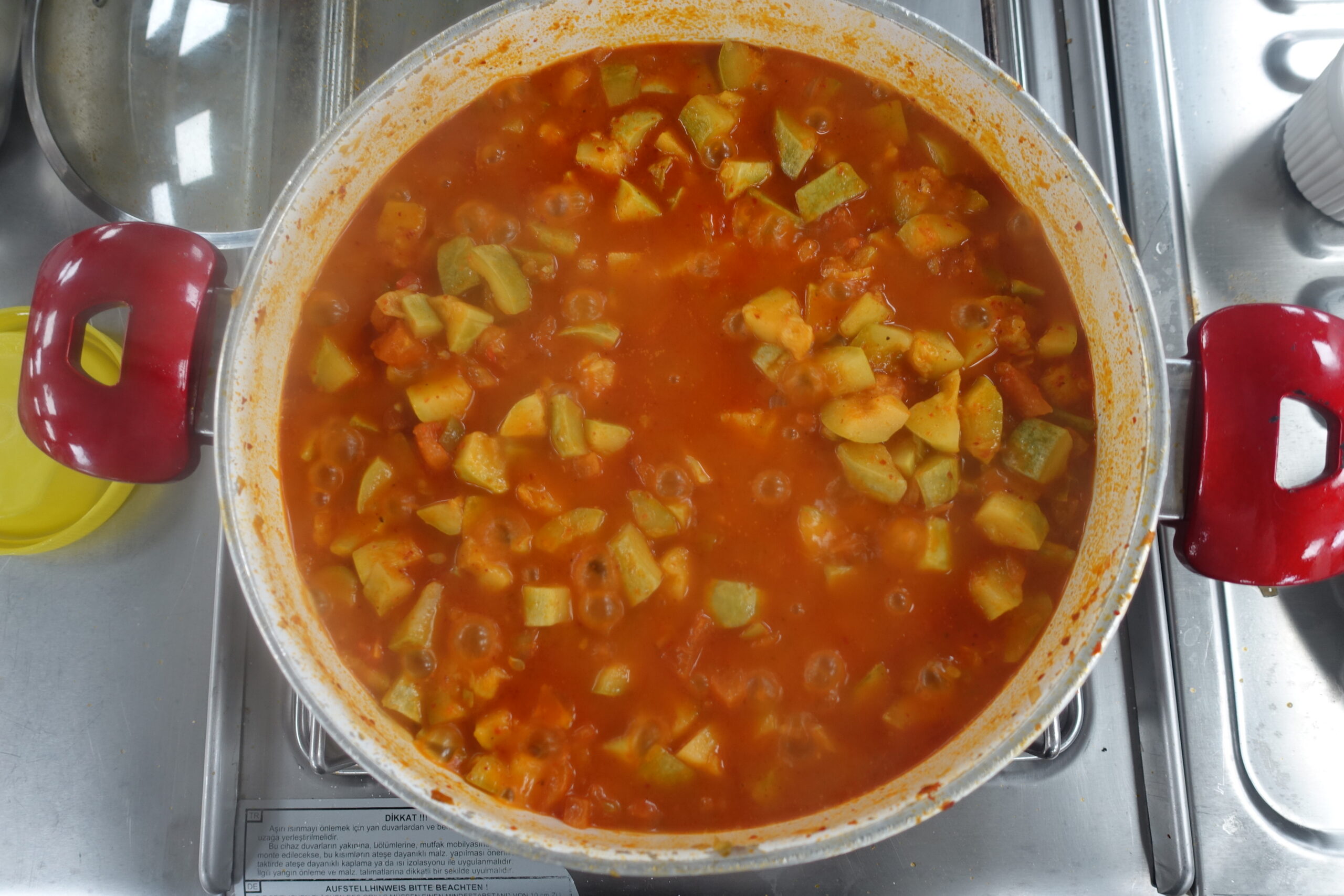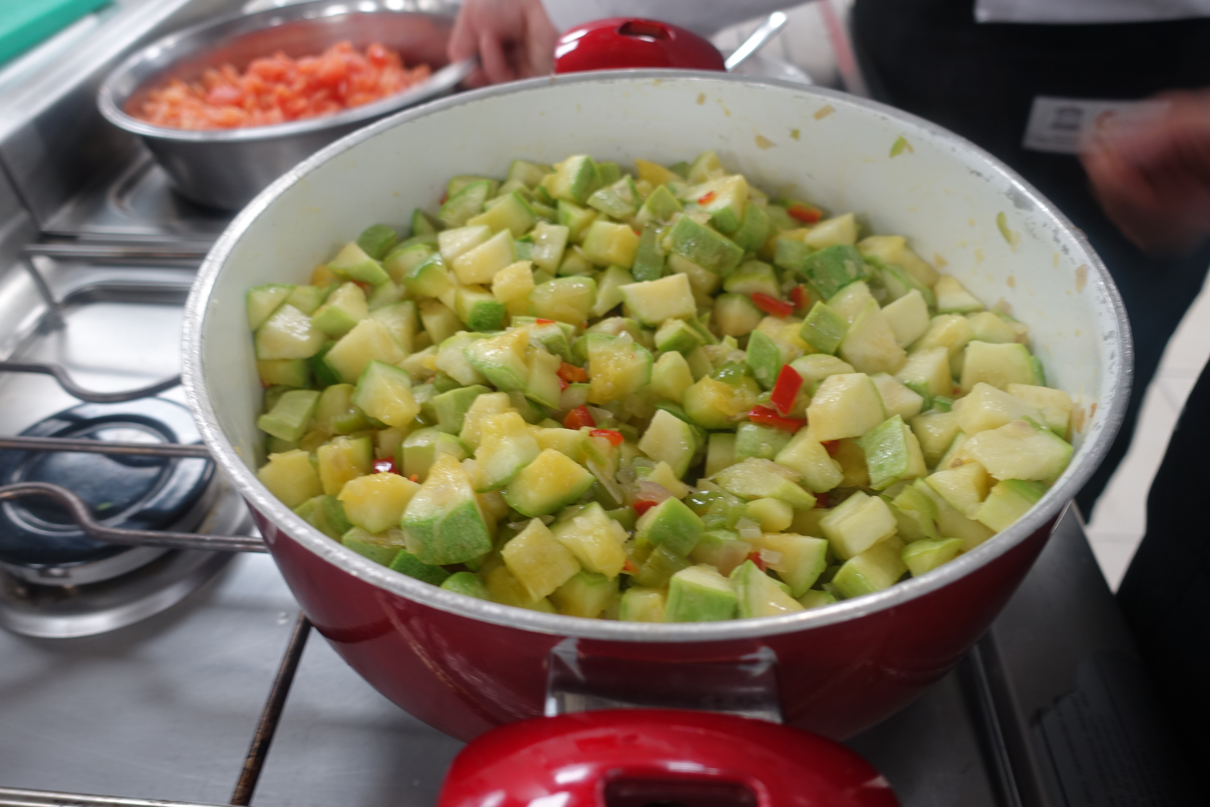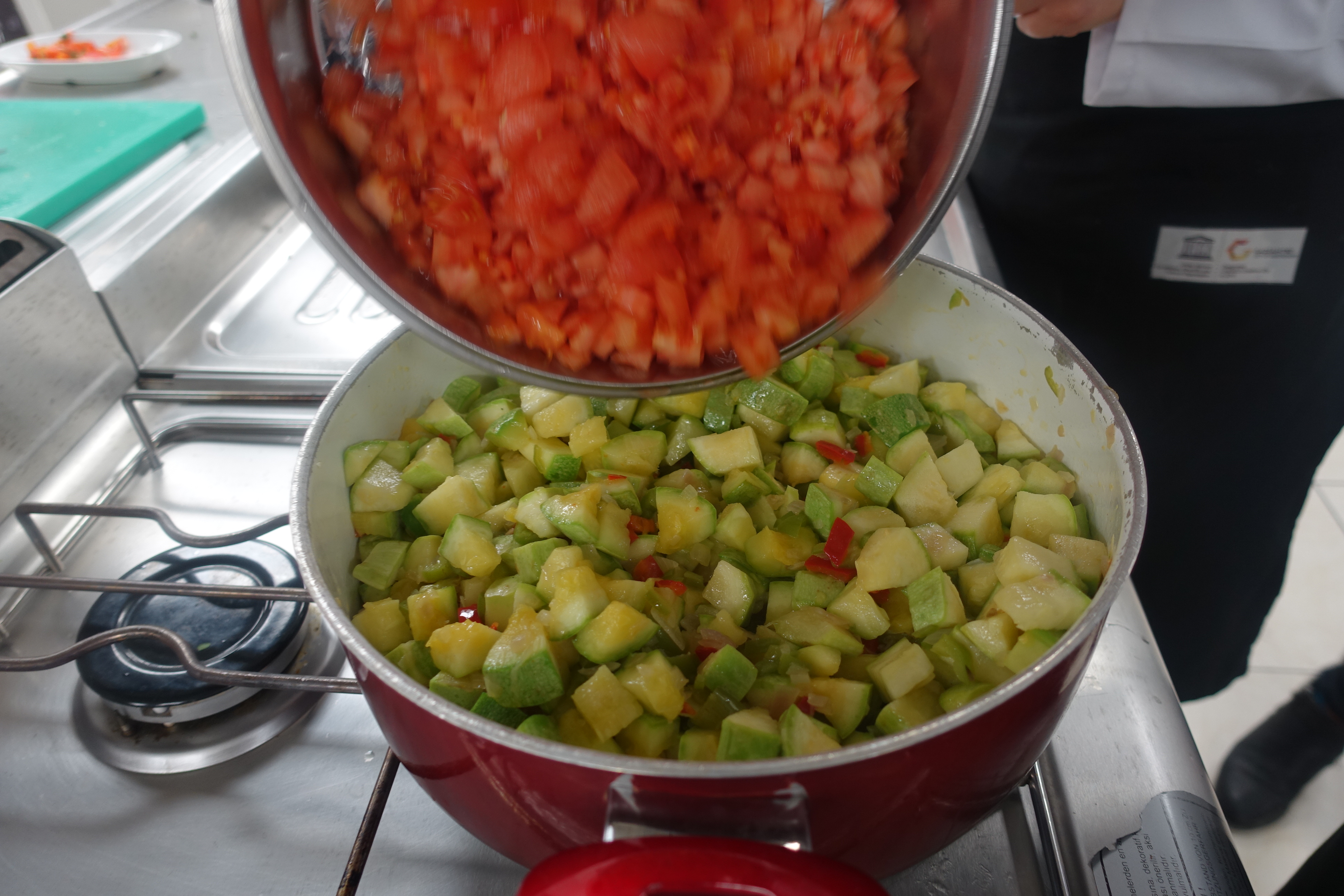 Then add the chunks of zucchini. Cover with water, approximately 4-6 cups and stir.