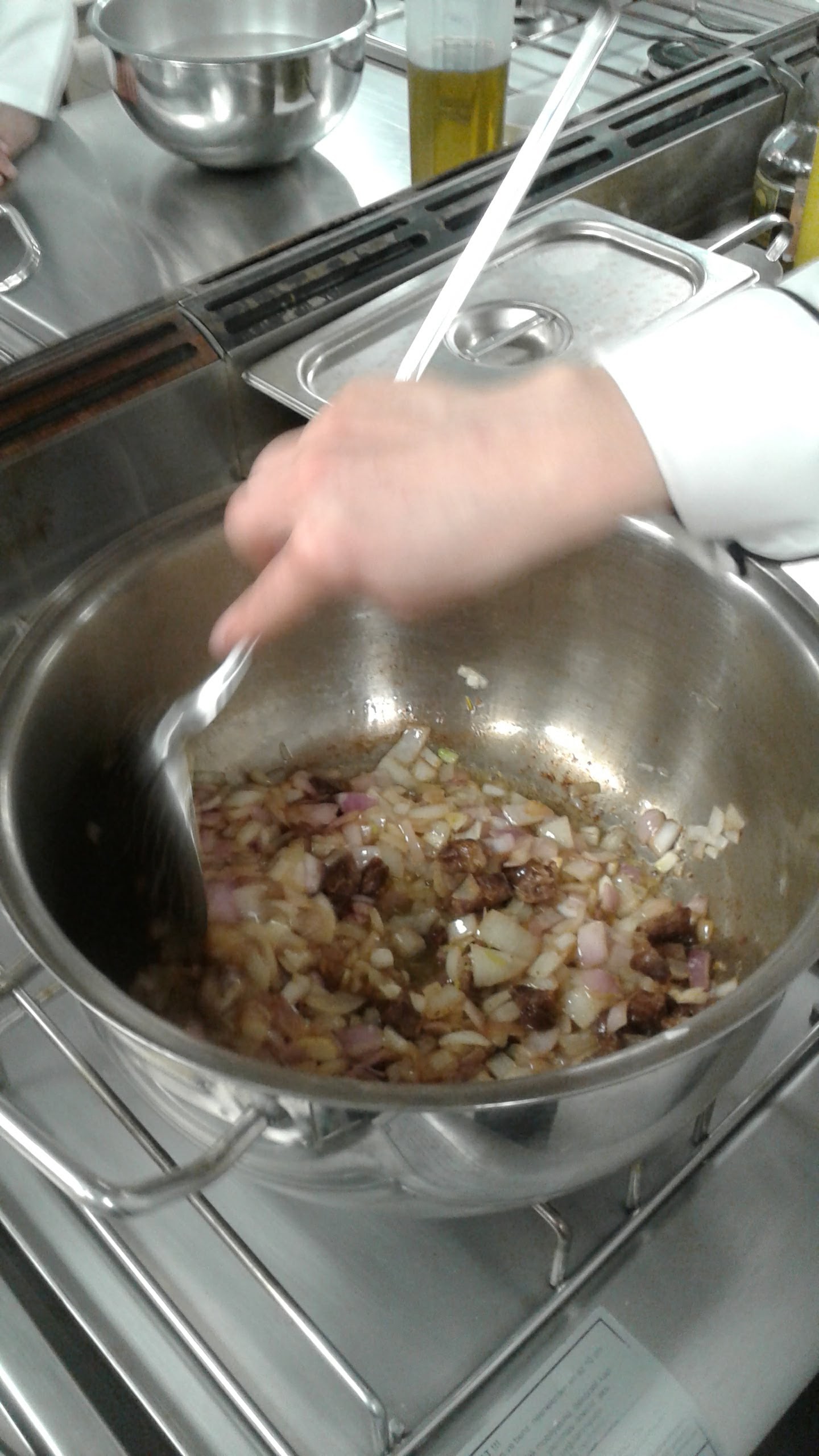 Add the onions and the garlic and cook until the onions are translucent.