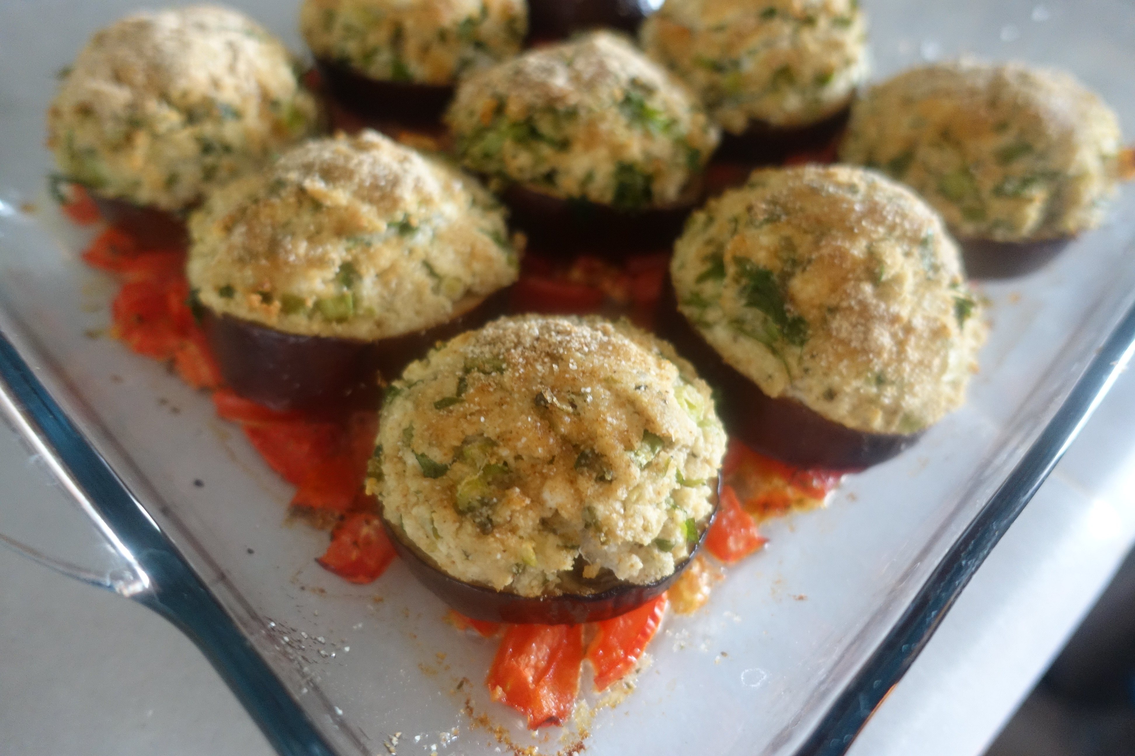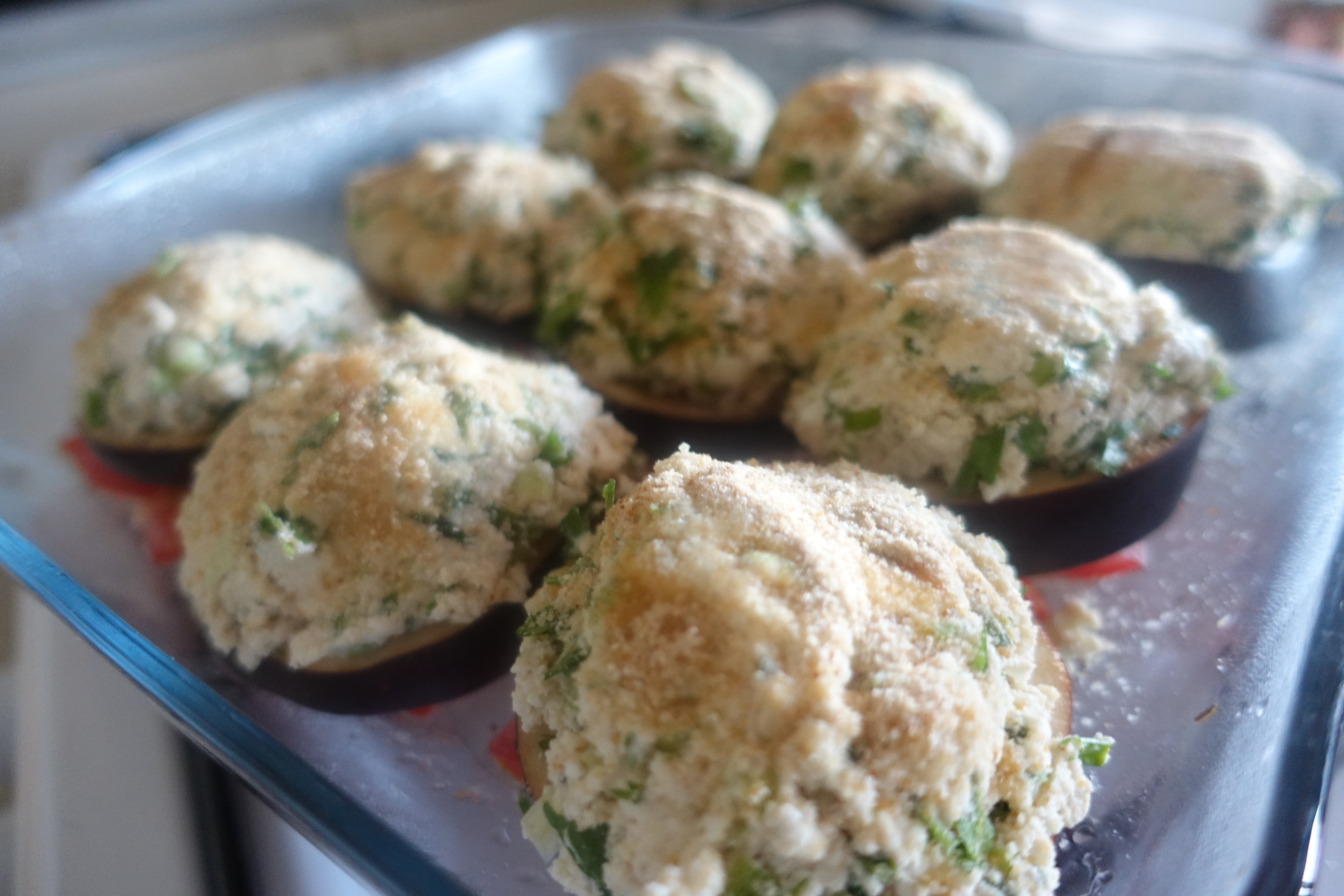 To prepare the eggplant: Slice the eggplant into thick round pieces. Season with salt and then one by one, spoon the filling on top of each eggplant round to create a nice mound of filling. Sprinkle over a few breadcrumbs on top and bake in the oven for 30-40 minutes or until the eggplant is tender and the filling is lightly browned.