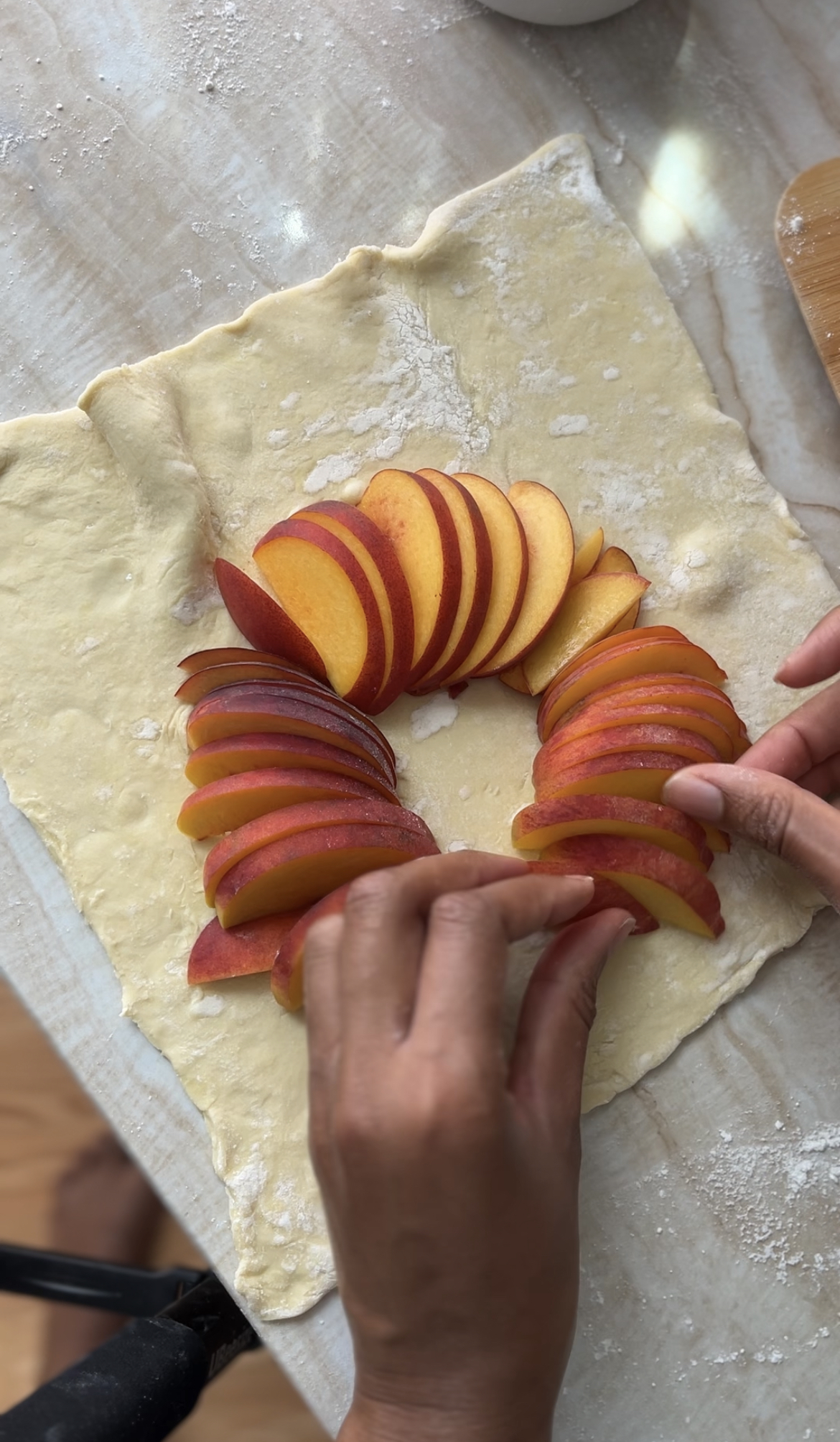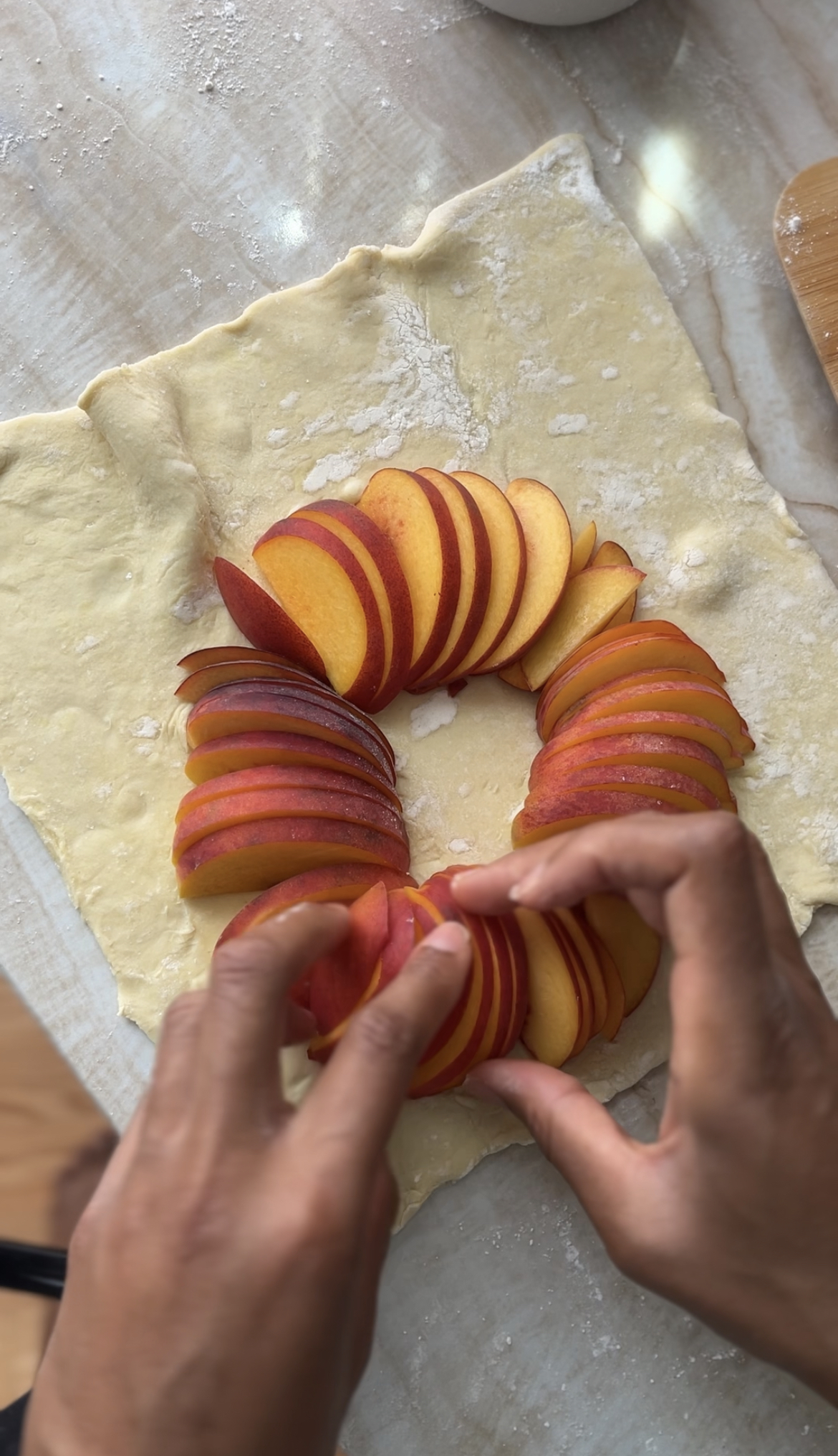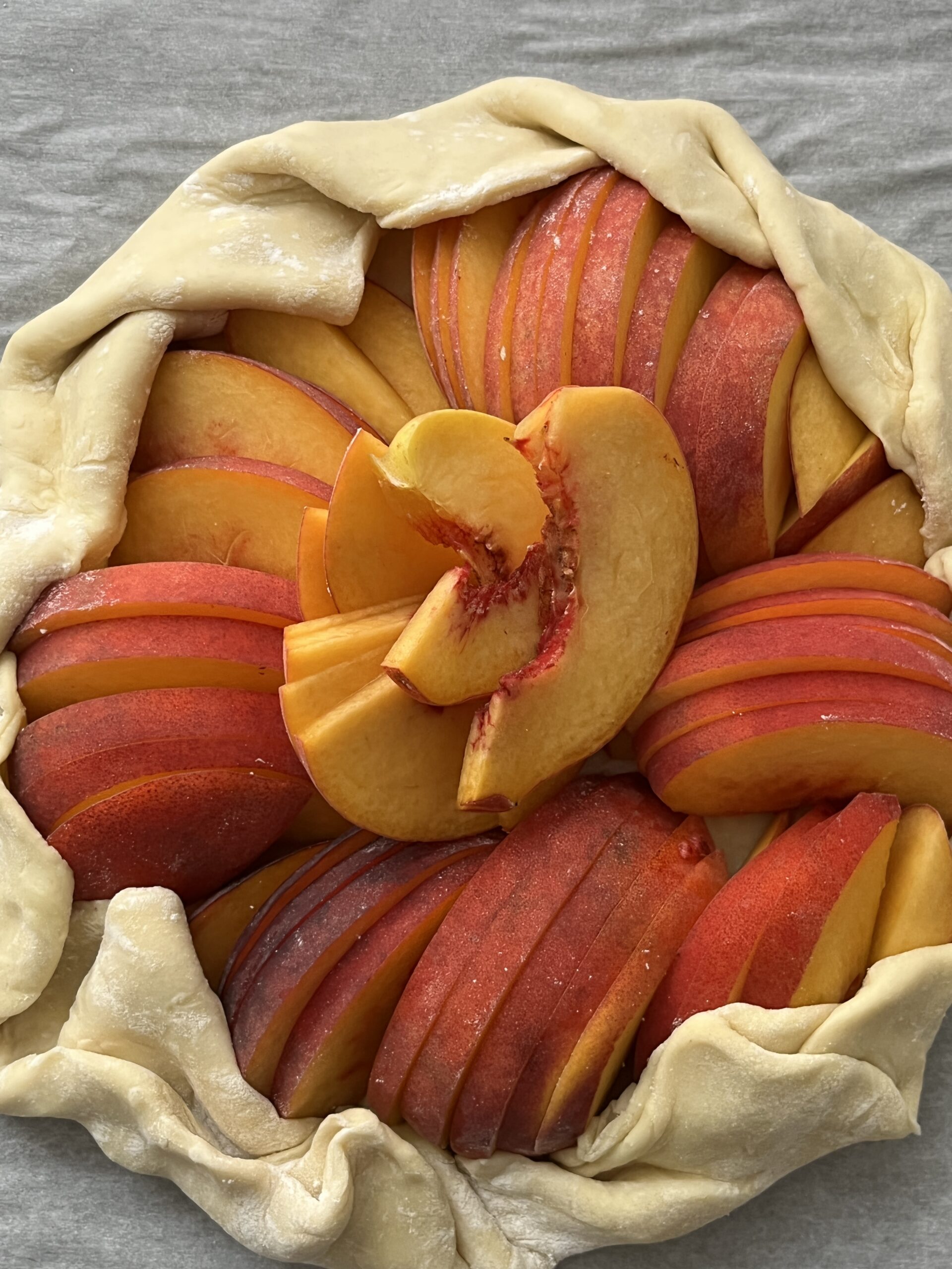 - Arrange the peach slices in the middle of the dough to in a cricle. Note: it doesn't have to be neat or perfect. It's okay if some of the peaches overlap.