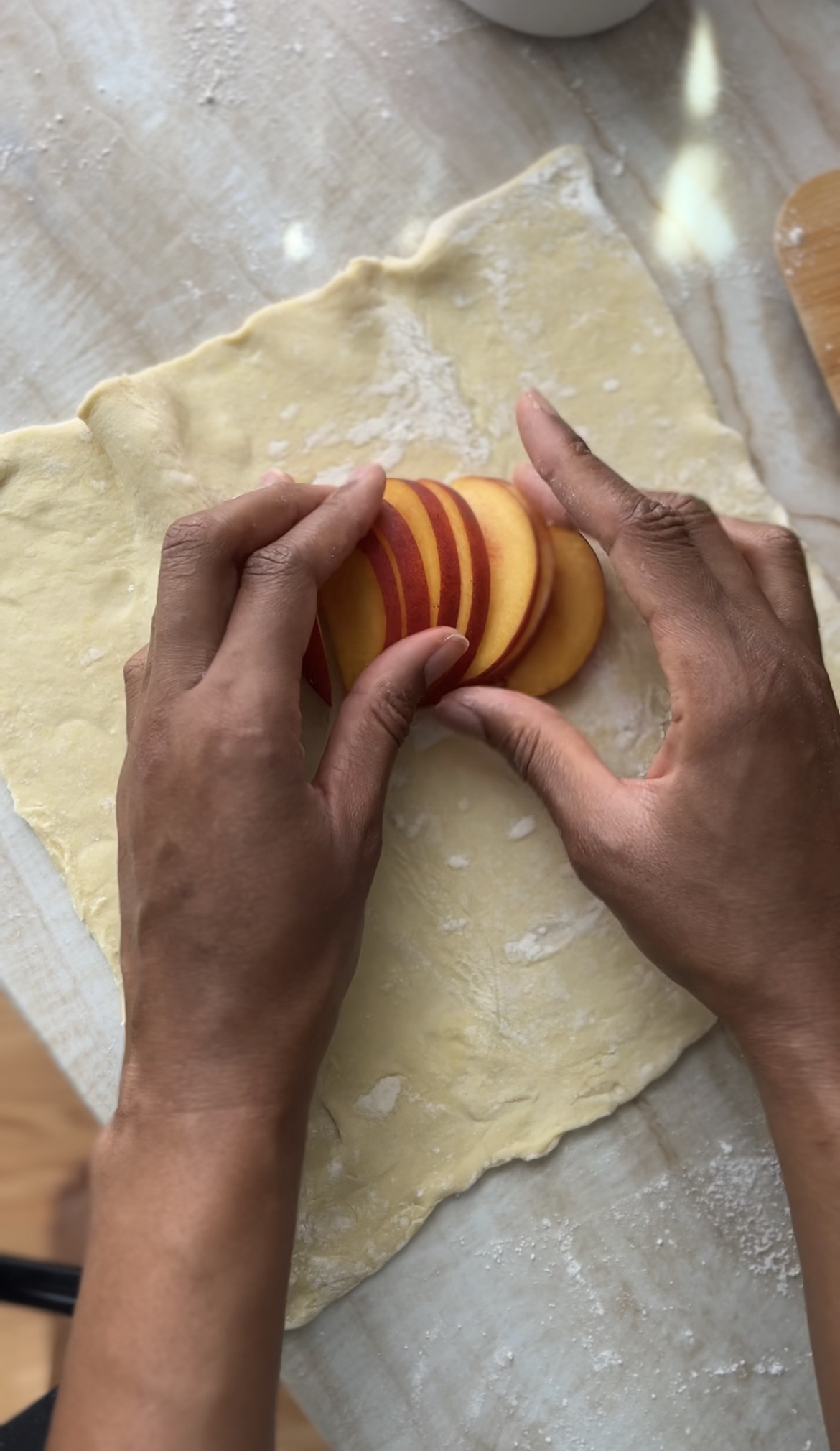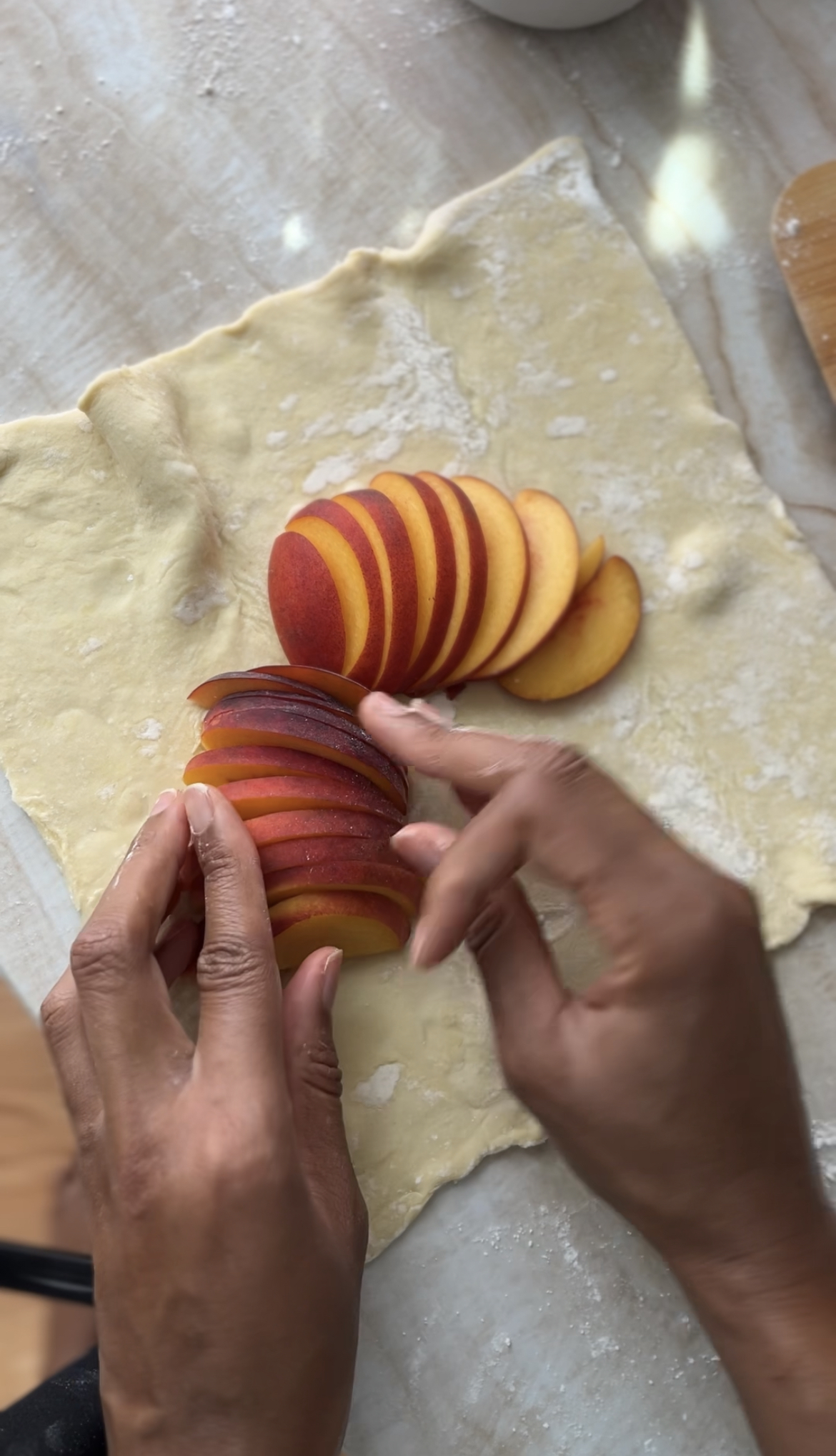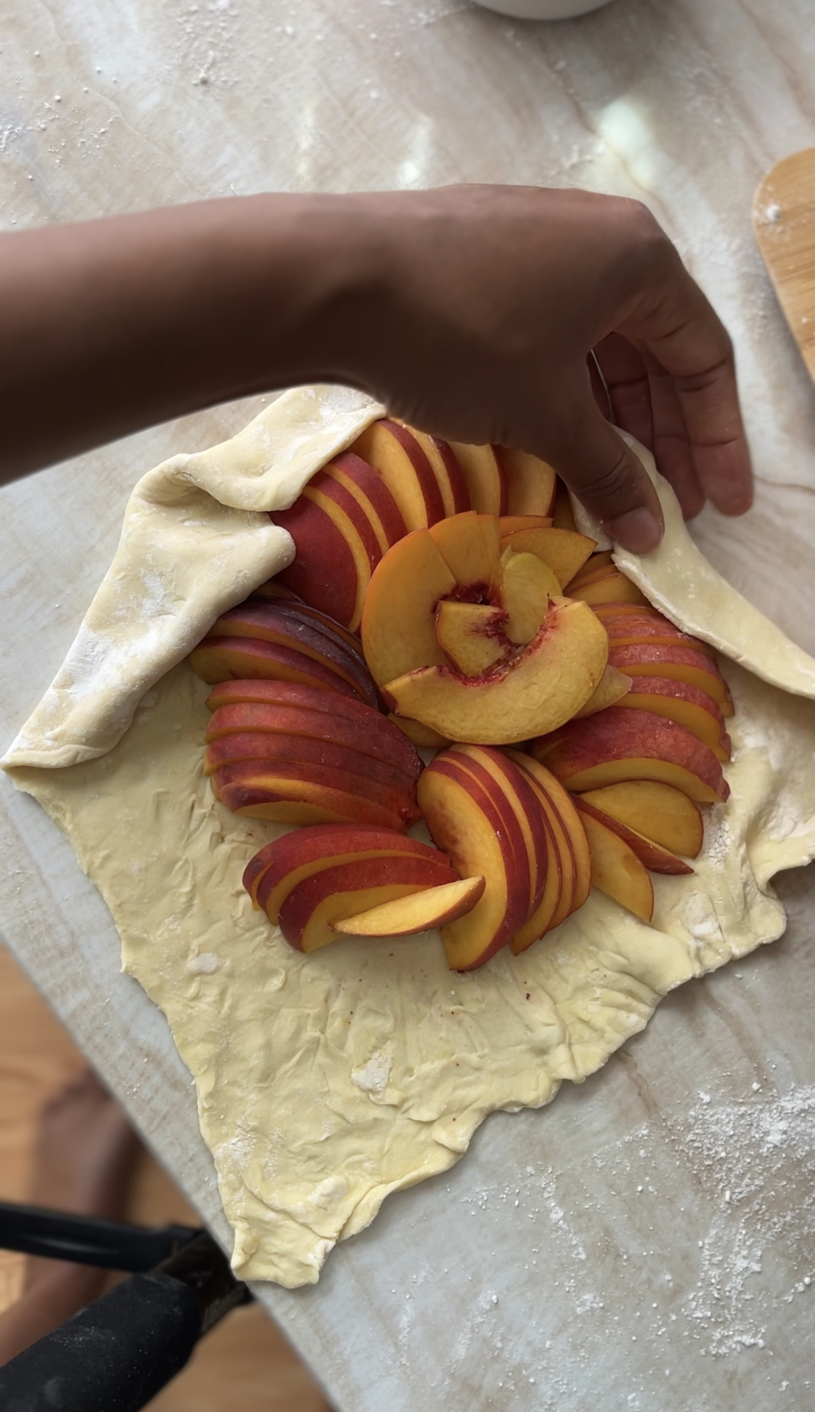 - Arrange the peach slices in the middle of the dough to in a cricle. Note: it doesn't have to be neat or perfect. It's okay if some of the peaches overlap.