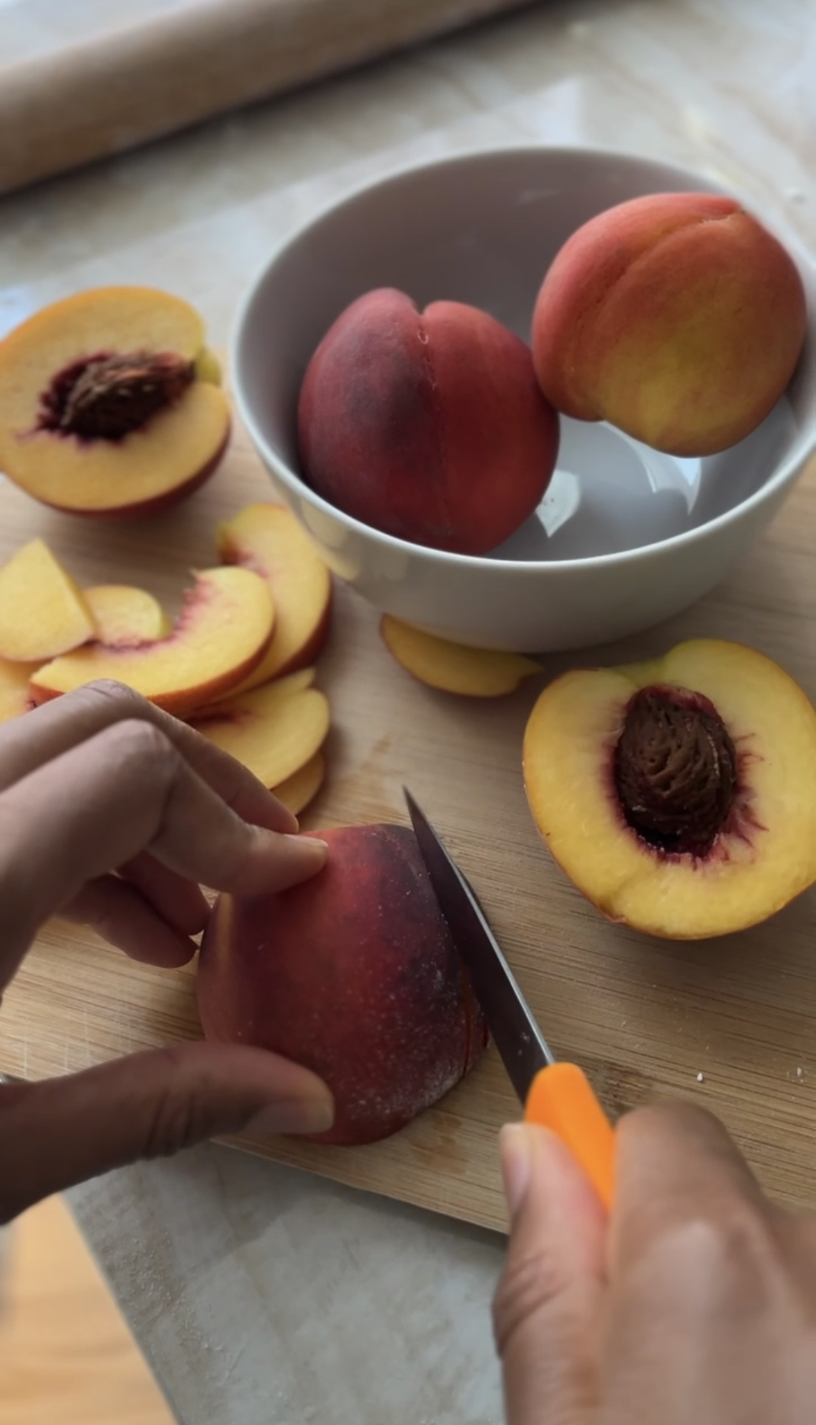 - De-pit the peaches and cut them into slices about 1/8 inch thick. Set aside.