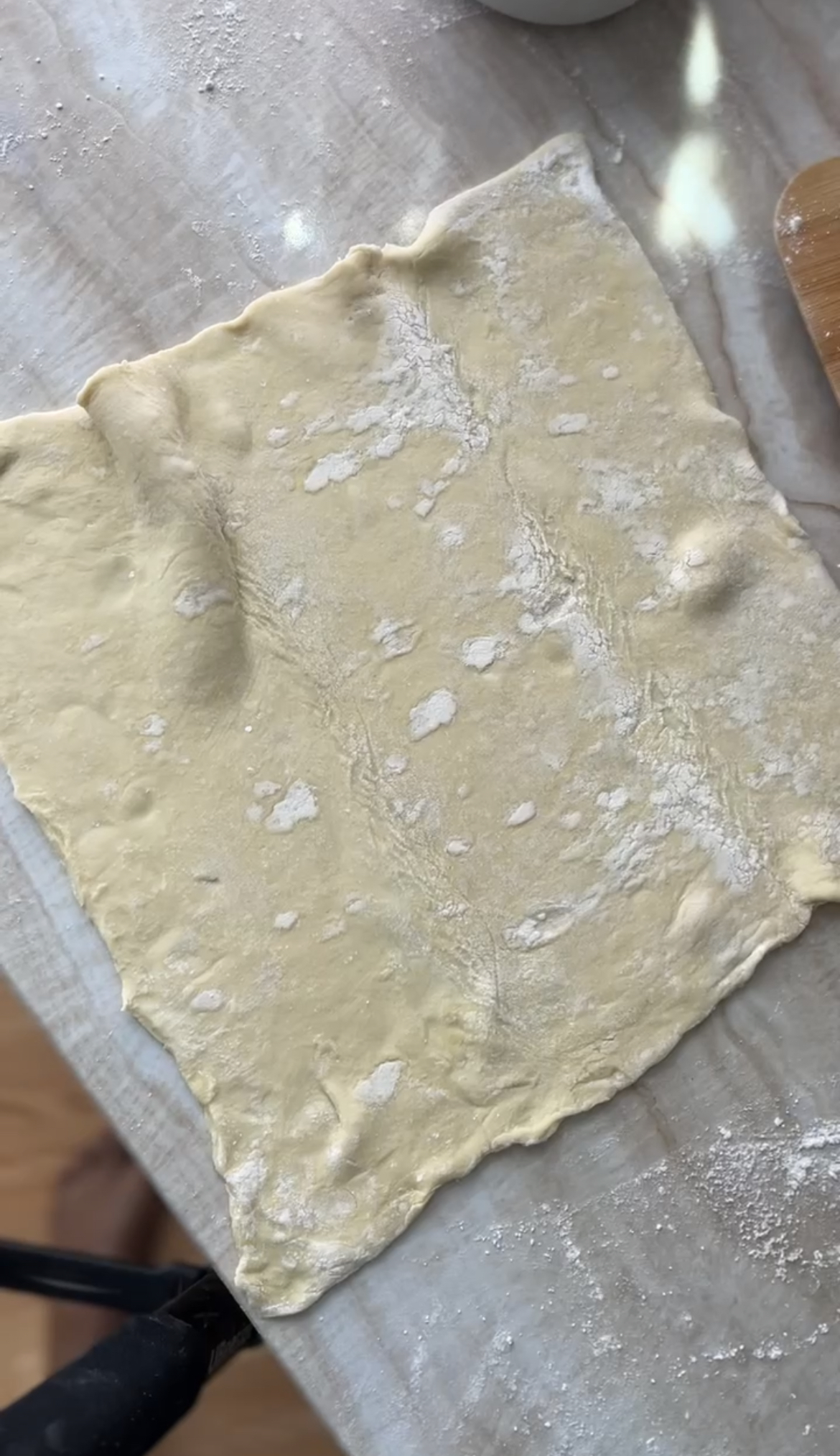 - Unwrap and unfold the puff pastry and dust the countertop with flour. Gently roll out the creases of the pastry, fold in half and transfer to the parchment lined baking sheet and unfold the pastry.