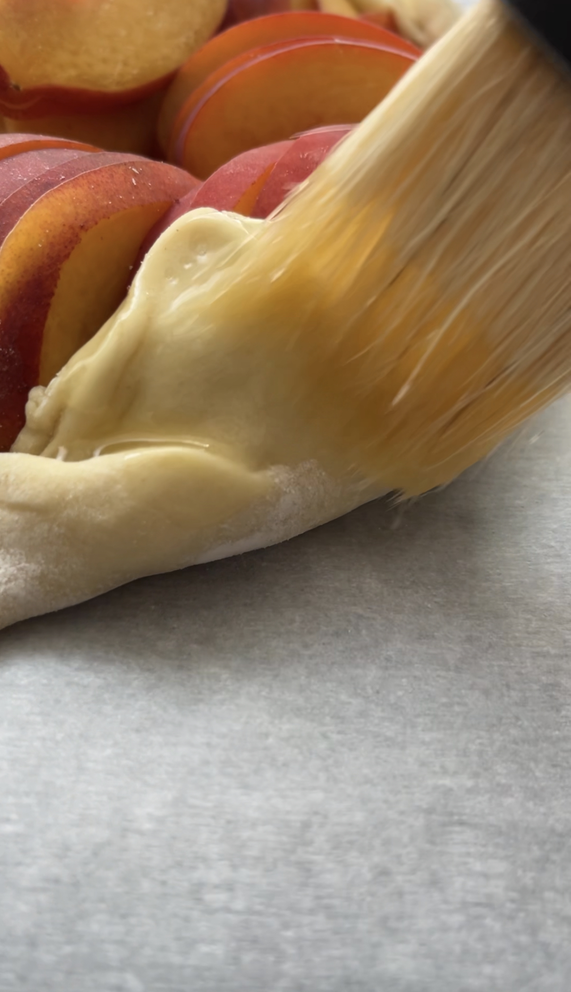 - Brush the exposed puff pastry and peaches with melted butter.