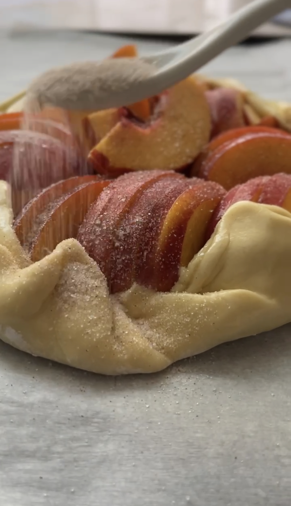 It’s like an open-faced pie that often prepared using a single pie crust, sometimes subbed with puff pastry or even shortbread, as the base, topped with fresh fruit, sugar and sometimes warm spices like cinnamon or nutmeg. The crust is folded only along the edges and the inner circle of fruit is exposed to create an aesthetically beautiful looking dessert.