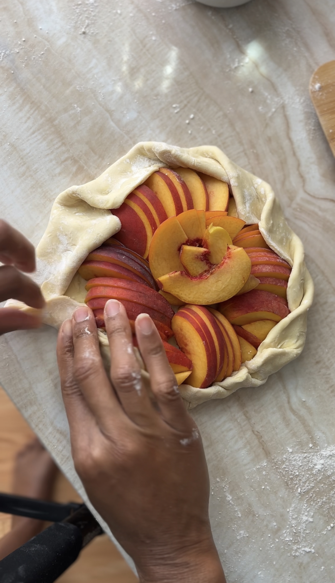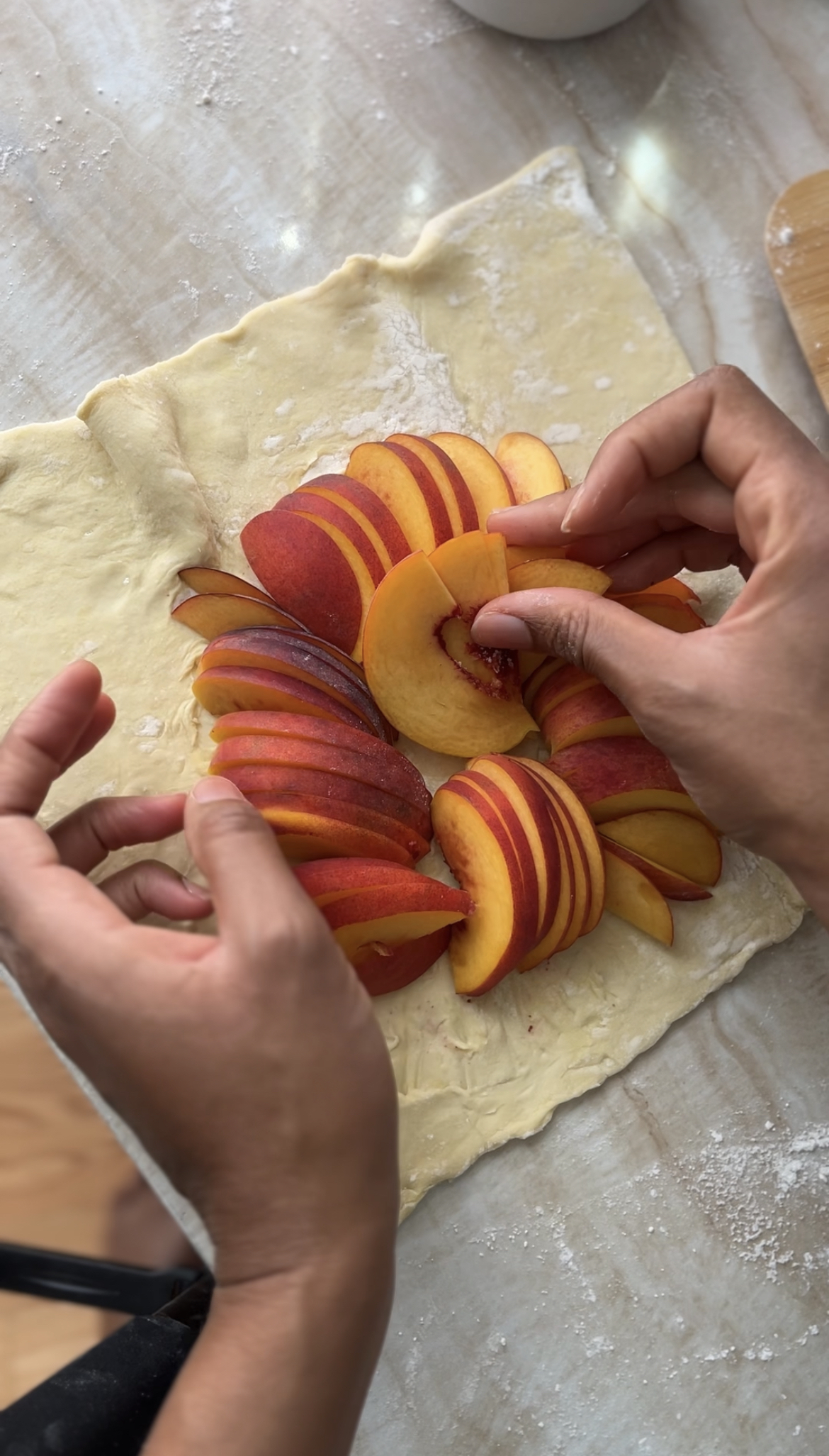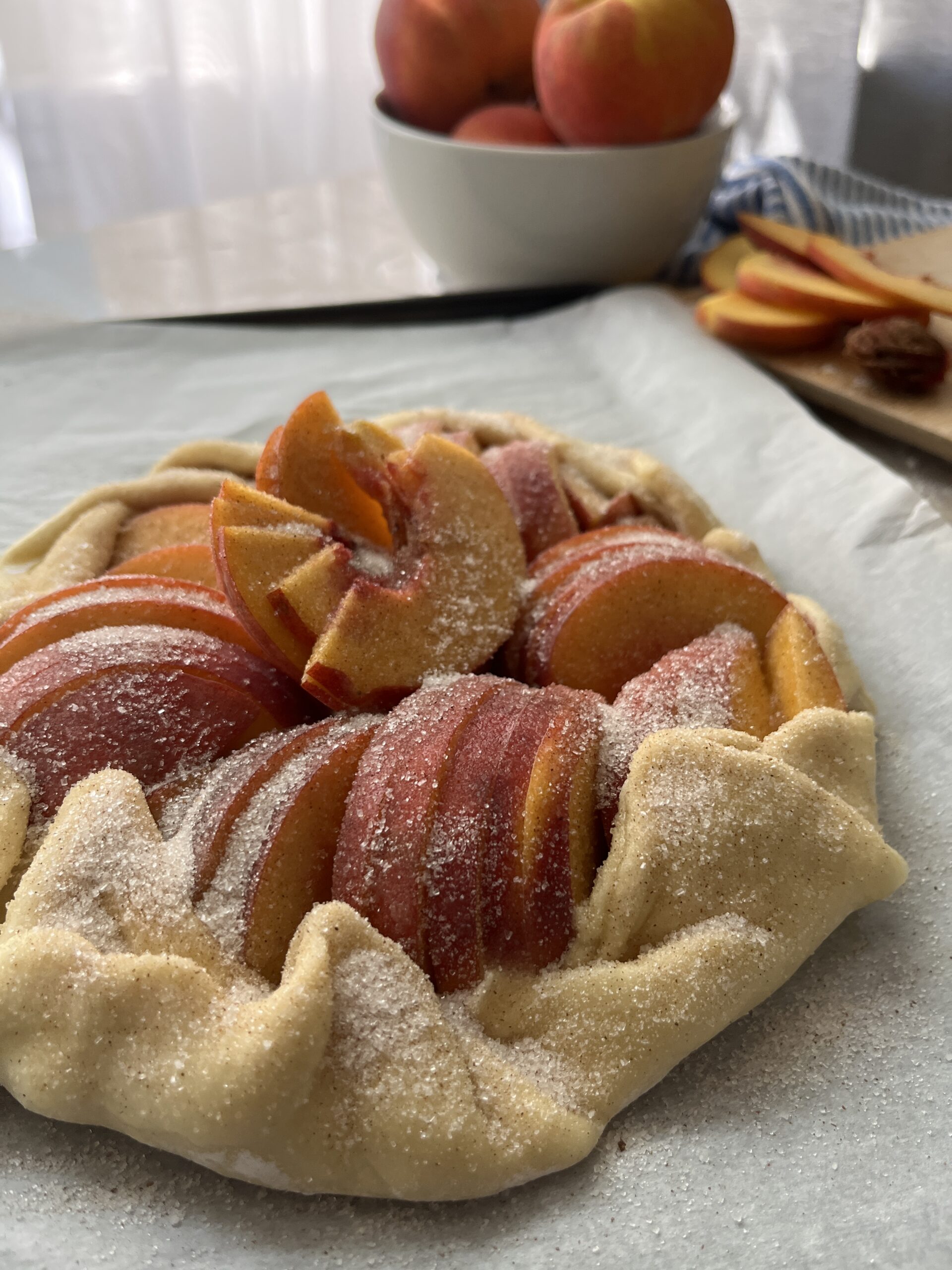 - Arrange the peach slices in the middle of the dough to in a cricle. Note: it doesn't have to be neat or perfect. It's okay if some of the peaches overlap.